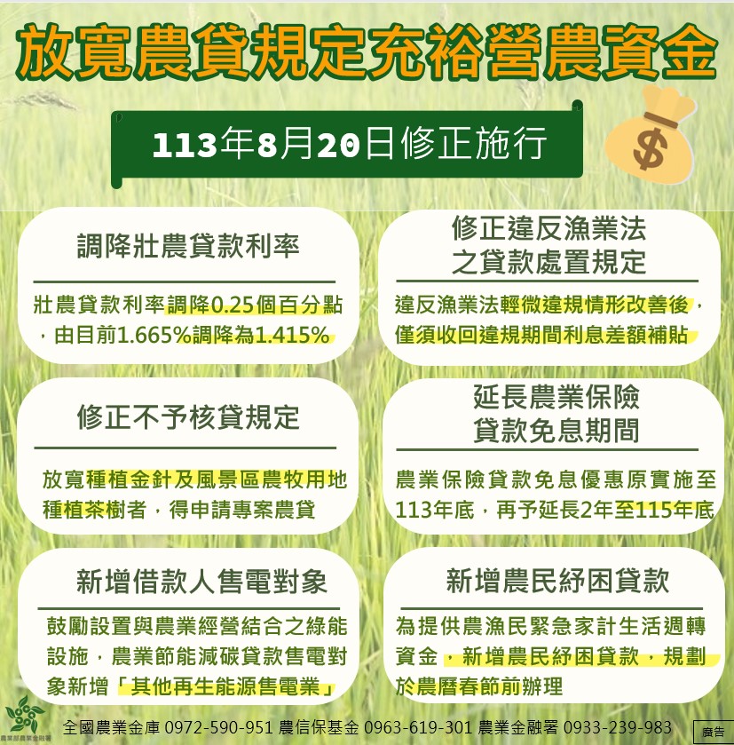 農業部為落實照顧農漁業者,長期推動專案農貸,以金融支持農業永續發展,自推動以來,已協助逾135萬戶農漁業者取得營農所需資金。本次為鼓勵壯農營農、推動農業保險政策、扣合產業實務需求及提供農漁民緊急金融支援,修正政策性農業專案貸款辦法等規定,自113年8月20日生效適用。主要修正內容包含調降壯農貸款利率、修正違反漁業法之貸款處置規定、修正不予核貸規定、延長農業保險貸款免息期間、新增借款人售電對象及新增農民紓困貸款,修法受益對象至少7,300人以上,預估每年增加提供逾33億元貸款額度予農漁業者,充分支應營農所需資金。