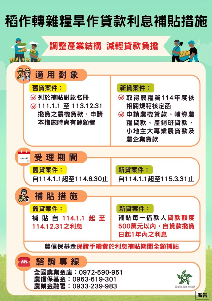 農業部推動「1集2轉3加3」稻米產業精進政策,調整產業結構,逐步引導農民轉作雜糧,特訂定稻作轉雜糧旱作貸款利息補貼措施作業原則,提供農民及相關業者貸款免息措施,減輕利息負擔,符合資格條件者自114年1月1日起可就近向農漁會信用部或全國農業金庫申請。