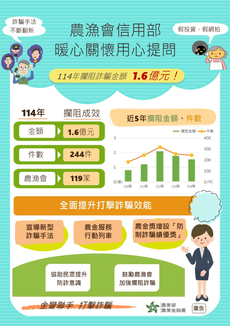 農業部農業金融署為降低詐欺風險,配合內政部警政署等單位,全力遏阻詐騙案件,要求全體農漁會信用部櫃檯人員落實執行防範金融詐騙工作,對於臨櫃客戶應予以關懷,發現疑似遭詐騙情形時,立即通報管區警員到場協助處理,共同合作防止金融犯罪,守護民眾財產安全。114年度成功攔阻詐騙總件數244件、攔阻金額新臺幣(以下同)1億5,946萬元。