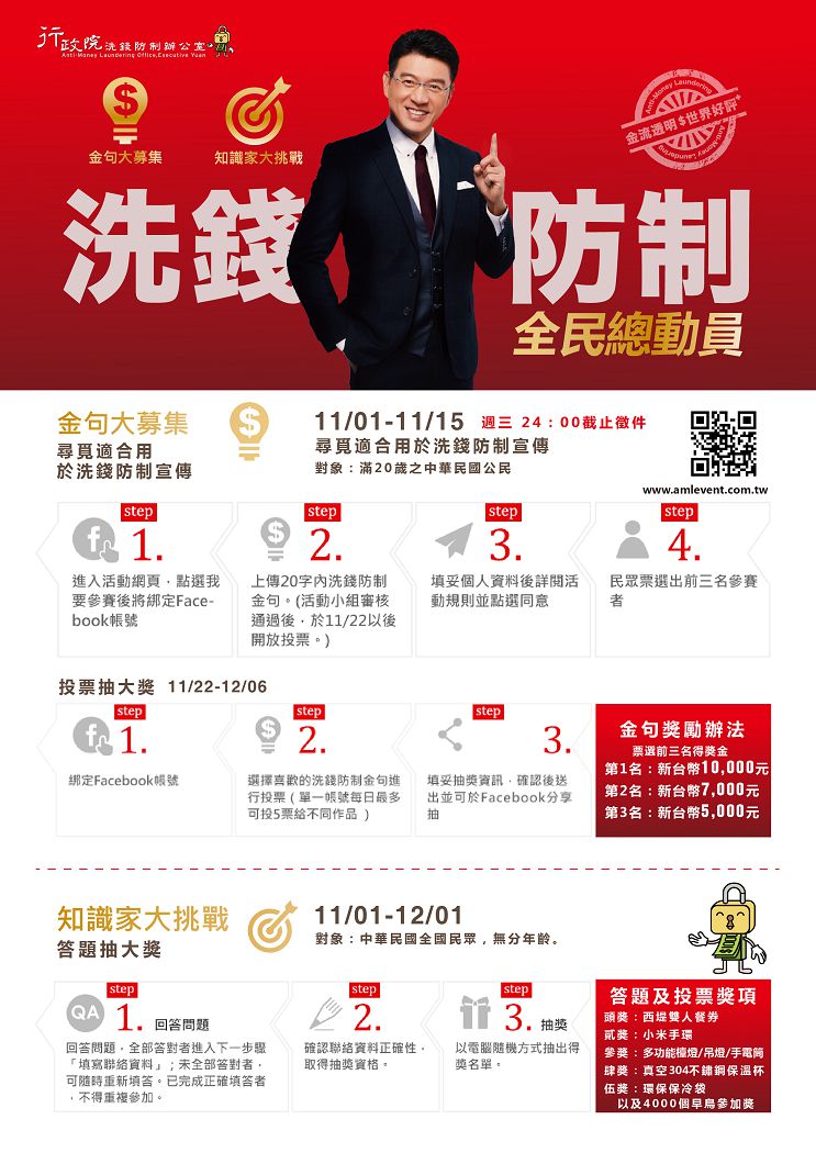 行政院洗錢防制辦公室舉辦洗錢防制金句大募集及知識家大挑戰有獎活動,請踴躍參與活動